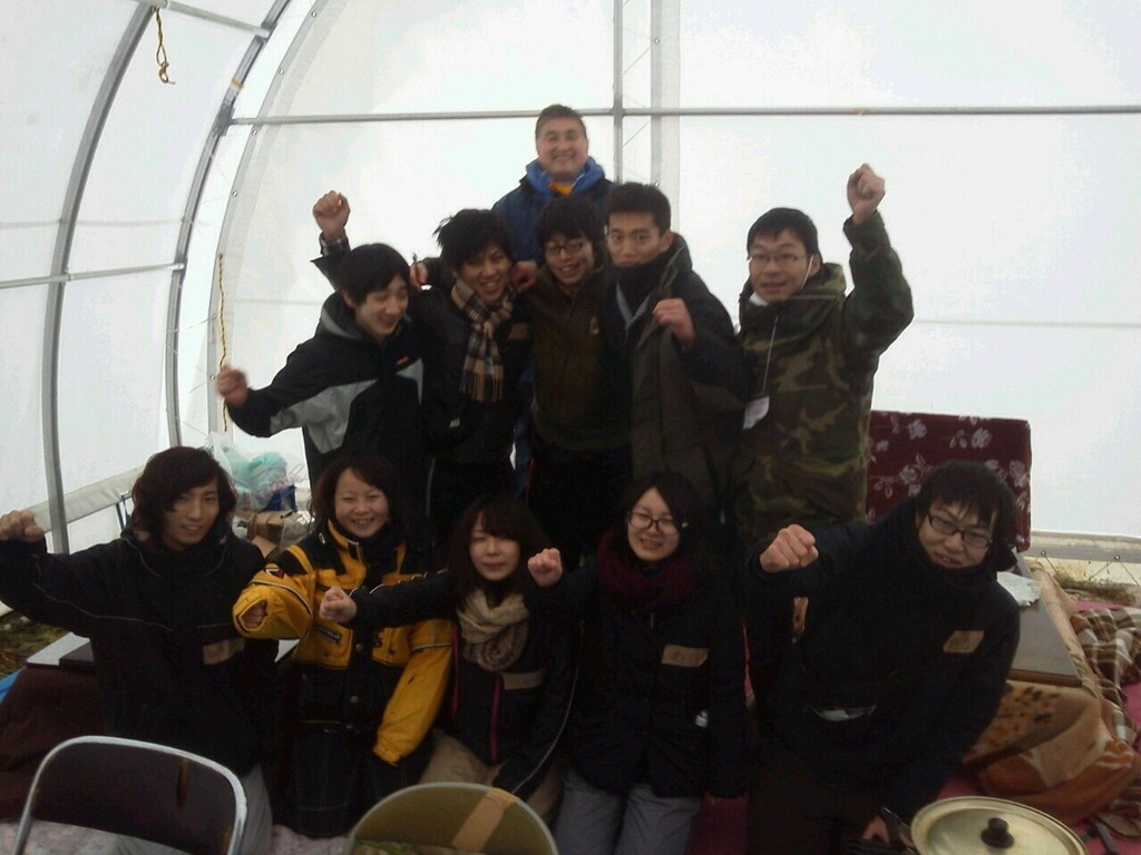 センターが阿部さん。それとこの日泊っていたボランティアスタッフのみんな。
